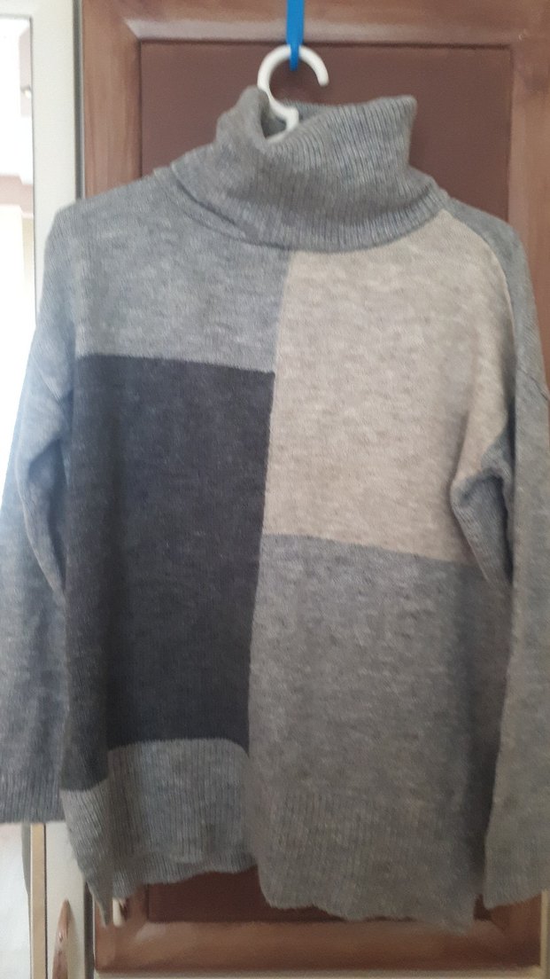 Kadınlar için yüksek boğazlı, uzun kollu, yumuşak örgü kumaştan yapılmış gri tonlarında renk bloklu rahat kesim kazak. Günlük kullanıma uygundur.