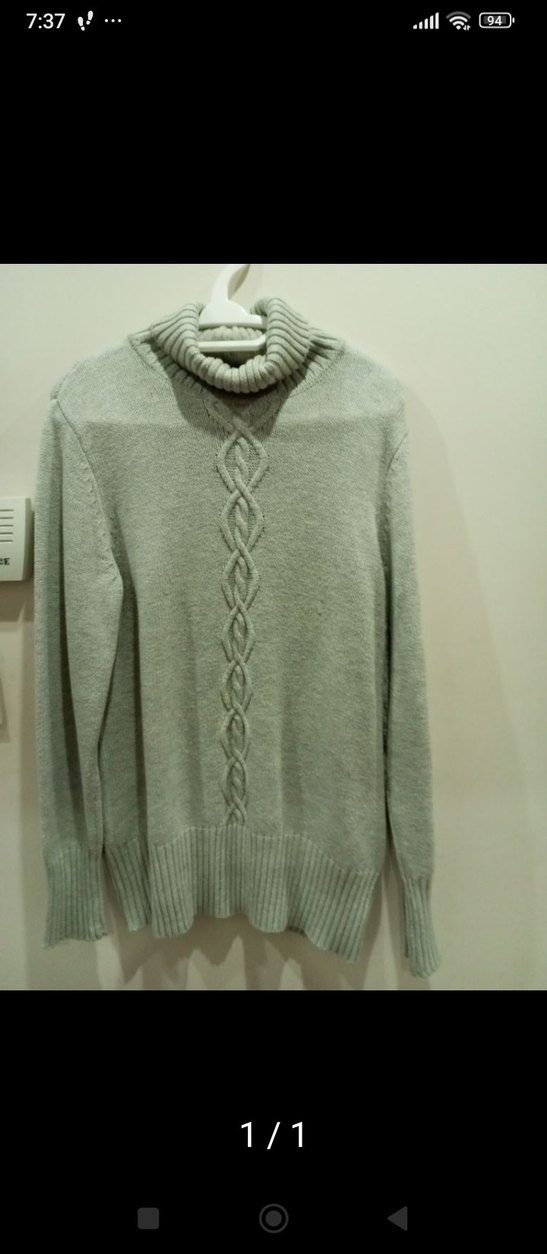 Gri renkte, boğazlı ve uzun kollu örgü kadın kazak. Rahat kesimi ve ortada kablo örgü deseniyle gündelik kullanıma uygundur.