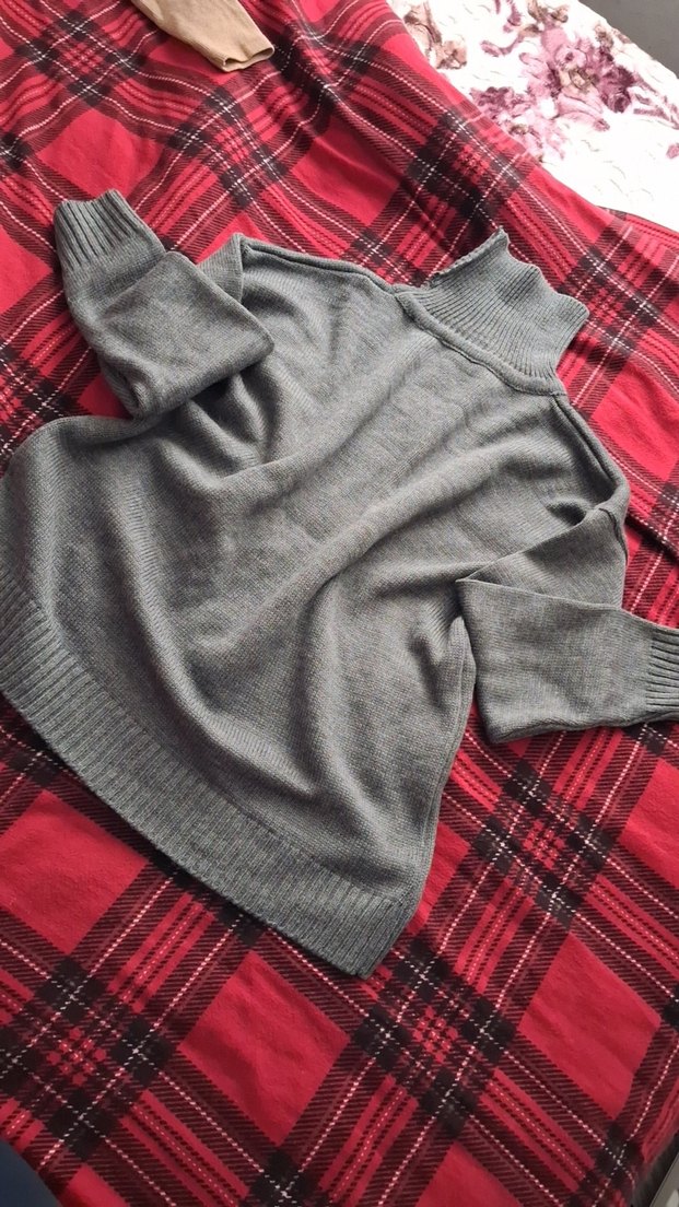 Gri renkli, boğazlı ve örgü dokulu, salaş kesim kadın kazak. Uzun kollu ve normal boyda, rahat ve günlük şıklık sunar.