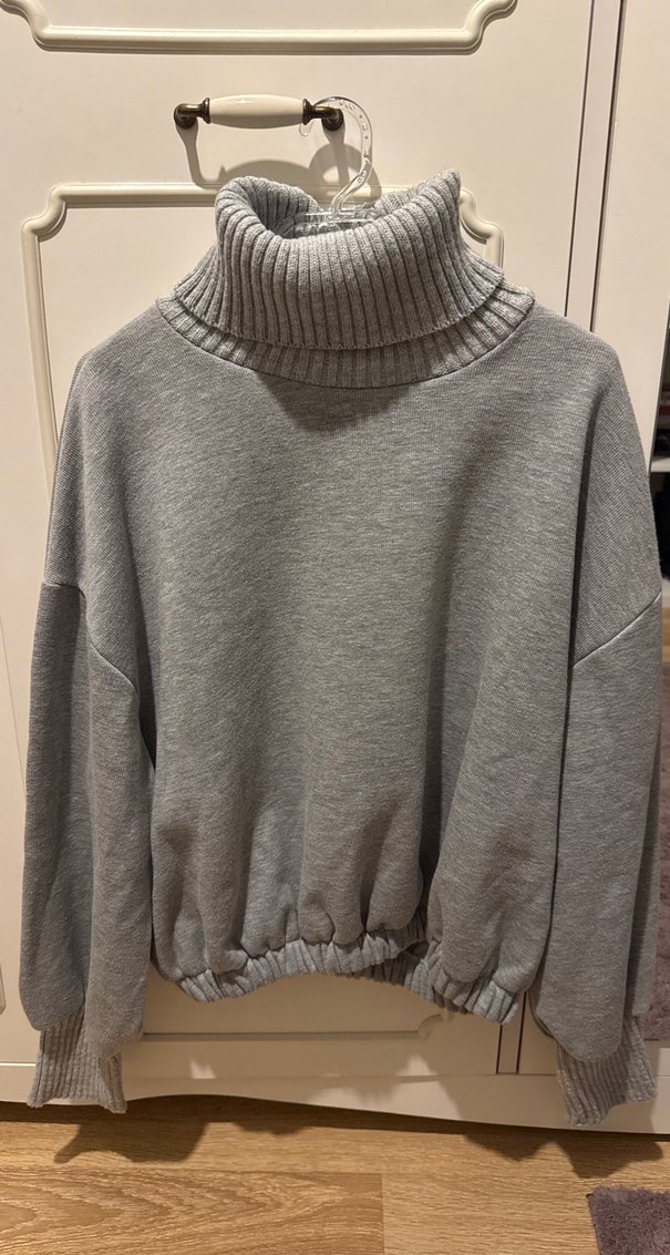 Gri renkte, boğazlı ve uzun kollu örme kadın sweatshirt. Rahat bol kesimi ve lastikli alt kısmı günlük kullanıma uygundur.