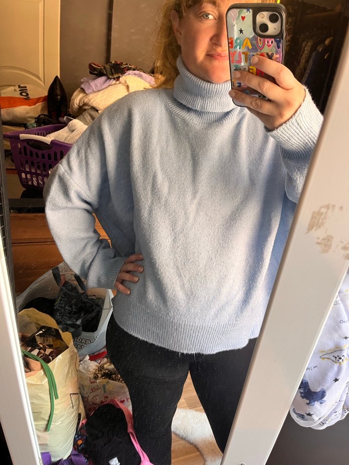 Bu gri yün kazak, boğazlı, uzun kollu ve rahat kesime sahiptir. Örgü yapısı ve midi boyu ile günlük kullanıma uygundur.