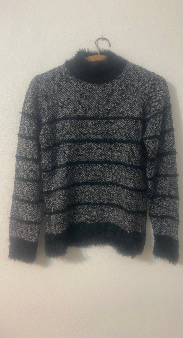 Gri zebra desenli, boğazlı ve uzun kollu, triko dokuma kadın kazak. Rahat ve sokak modasına uygun, günlük kullanım için ideal.