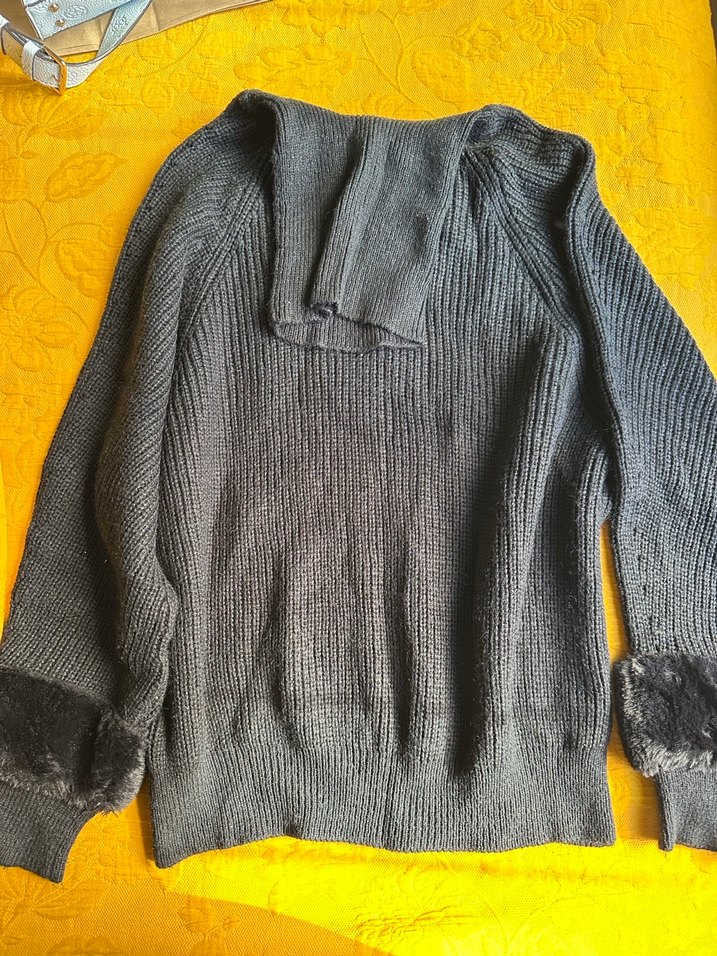 Gri renkli, boğazlı ve uzun kollu, kürk detaylı manşetlere sahip triko kazak. Salaş kesim ve normal boyda, günlük rahat kullanıma uygundur.