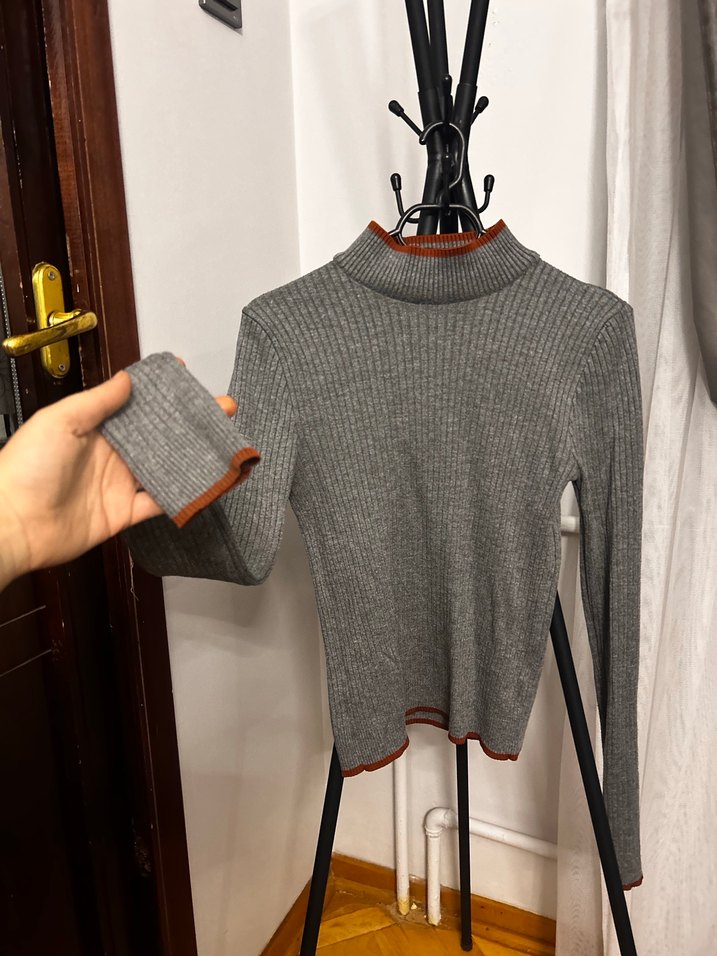 Bu gri boğazlı triko kazak, fitted kesimi ve uzun kollarıyla sıcak ve rahat bir stil sunar. Manşet ve yakada koyu turuncu detaylar bulunur.