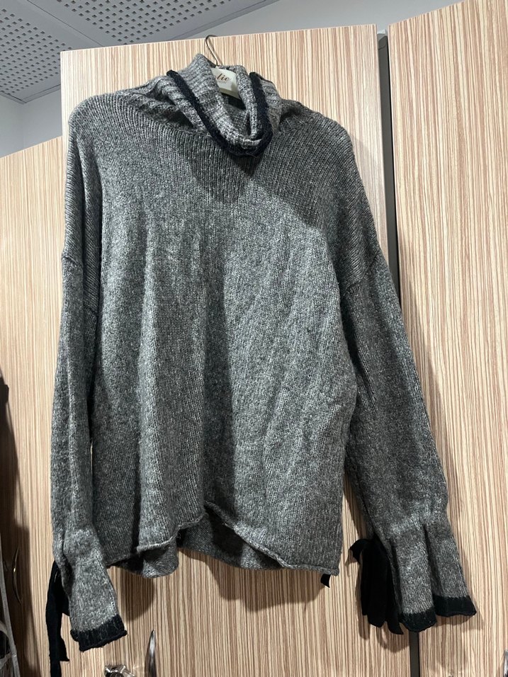 Gri renkte, boğazlı ve triko örgüden yapılmış kadın kazak. Bol kesim, uzun kollu ve manşetlerinde siyah kurdele detayları bulunur. Rahat ve günlük kullanıma uygun.