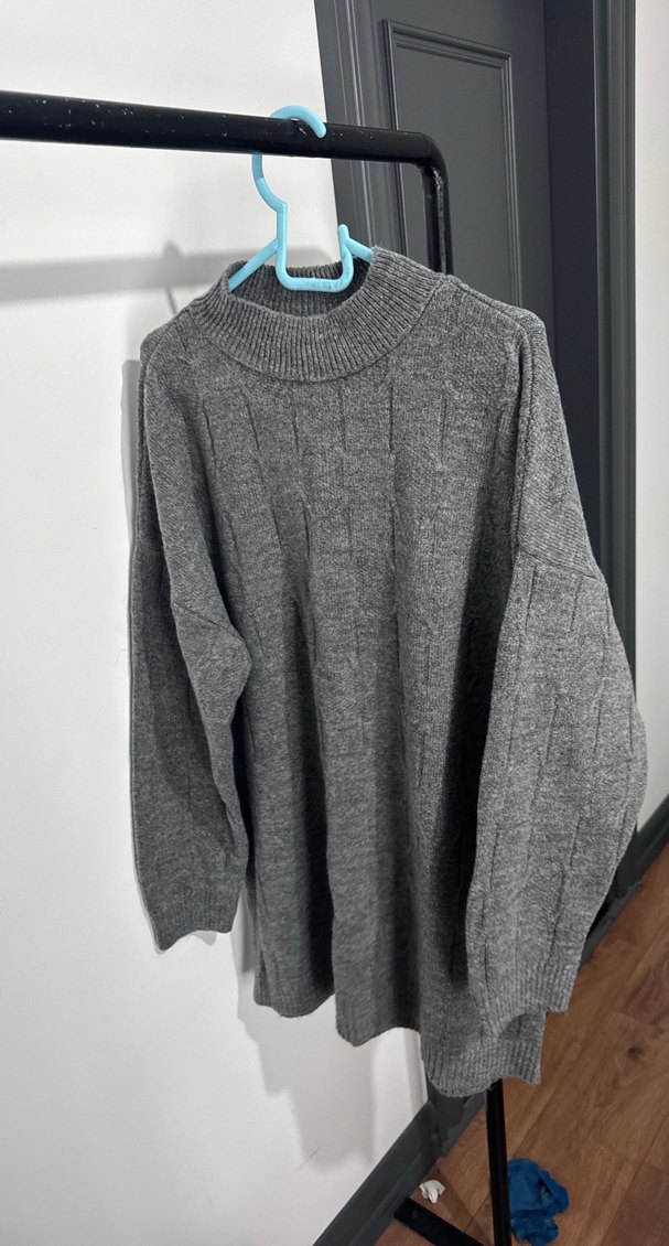 Gri renkte, boğazlı ve uzun kollu, rahat kesim örme kadın kazak. Normal boyda ve desensiz, konforlu ve trend günlük stil için uygun.