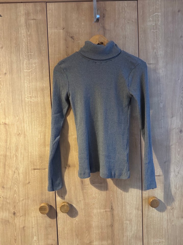 Gri renkte, boğazlı ve uzun kollu, triko dokulu kazak. Rahat ve günlük kullanıma uygun bir model.