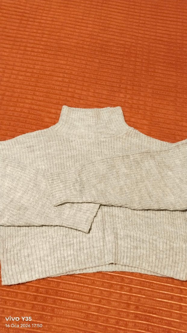 Gri renkli, boğazlı ve uzun kollu örgü kadın kazak. Salaş kesimi ve normal boyu ile sade, rahat,crop kazak