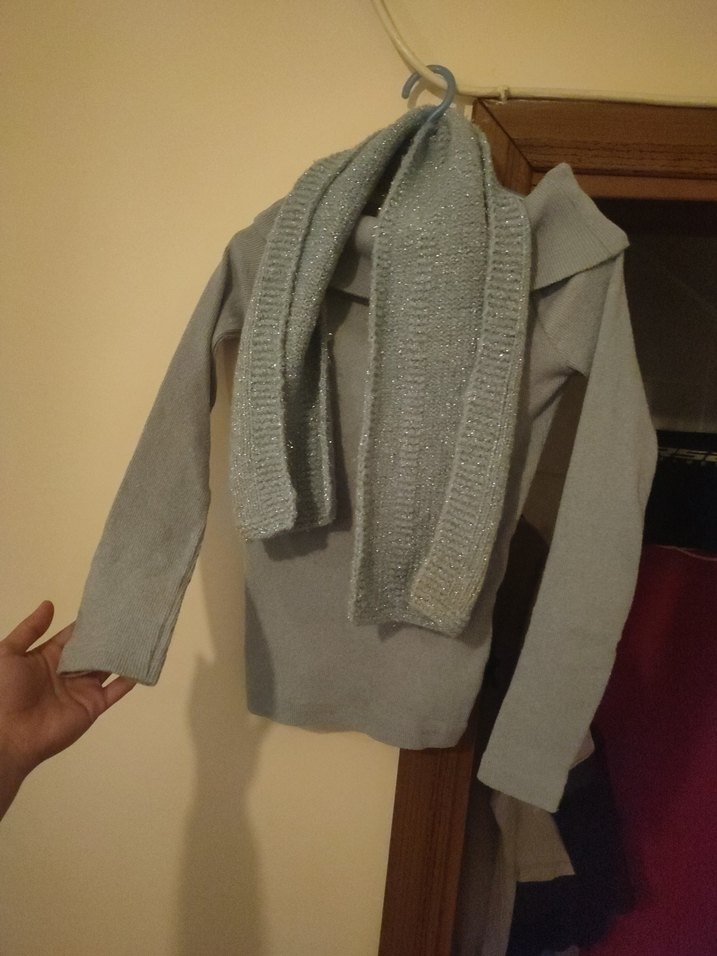 Gri renkli, boğazlı ve uzun kollu, triko dokulu kadın kazak. Rahat ve şık sokak tarzı için uygun, günlük kullanıma ideal. xs giyene de olur 8-9 yaş kız çocuk.icin de uygundur atkısı mavi simli yanında gelecek. mavi ve turkuaz arası rengi var
