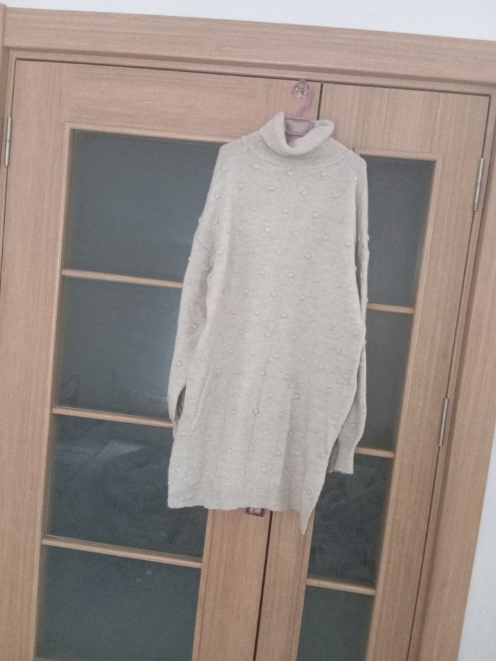 Boğazlı, uzun kollu, gevşek kesim, gri triko midi kadın kazak. Rahat ve günlük kullanıma uygun bir modeldir.