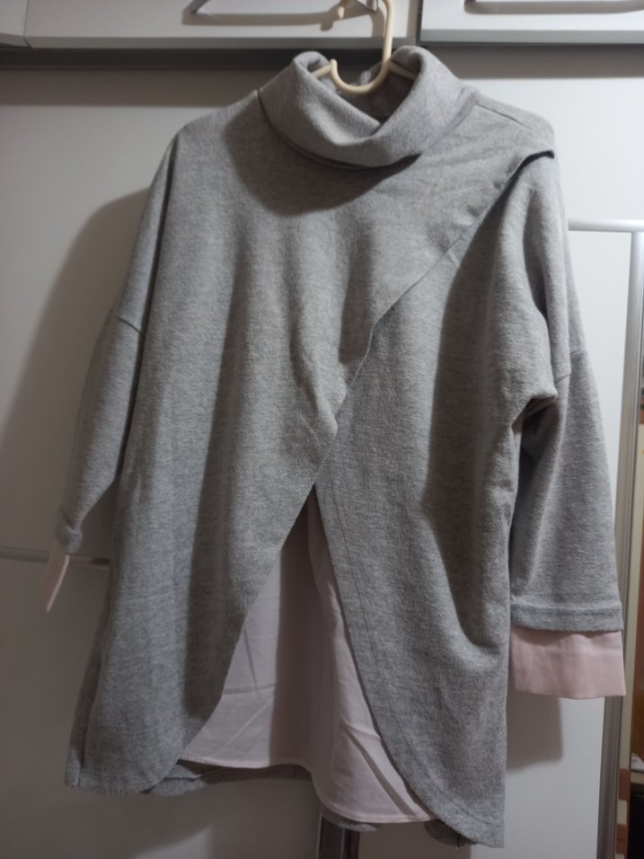 Gri boğazlı triko, bol kesim ve drapeli tasarıma sahip, uzun kollu ve yumuşak, sıcak kumaştan günlük kullanım için uygun.
