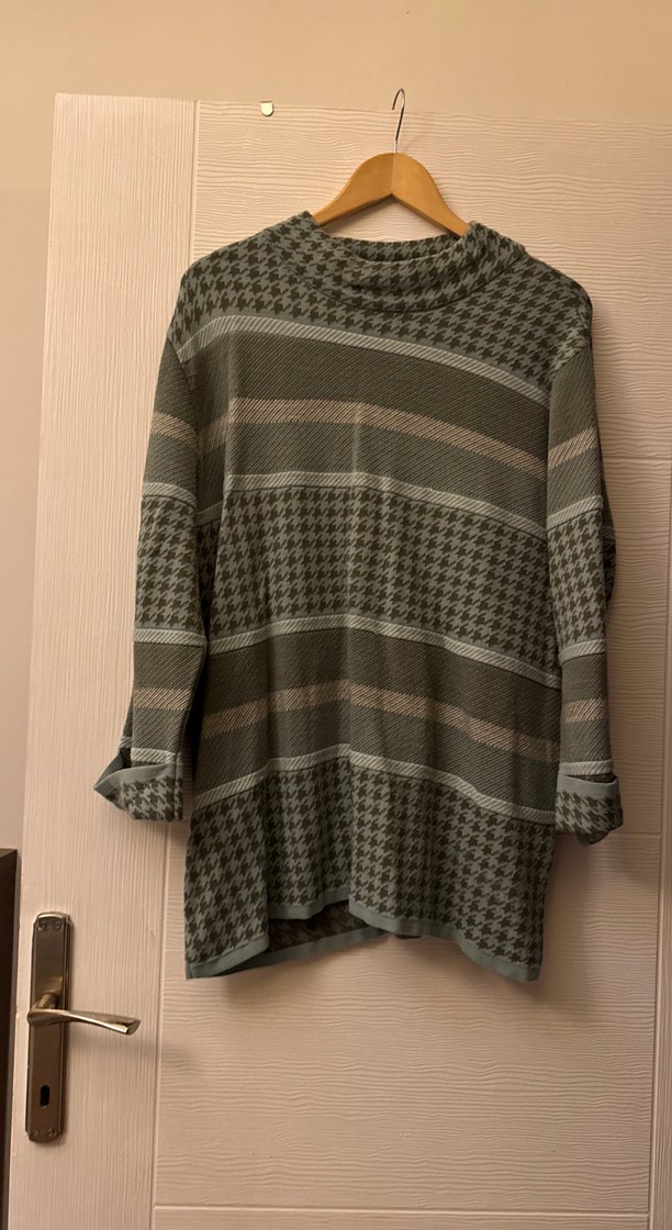 Gri renkte, boğazlı ve uzun kollu örme triko kazak. Rahat kalıp ve midi uzunlukta, gündelik kullanım için uygun. İnce desen detaylarıyla şık görünüyor.