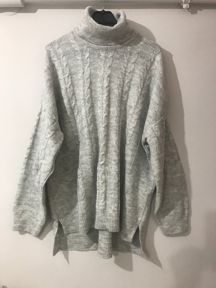 Boğazlı, uzun kollu ve bol kesimli gri örgü kadın kazak, rahat ve günlük kullanıma uygun uzun yapıda.