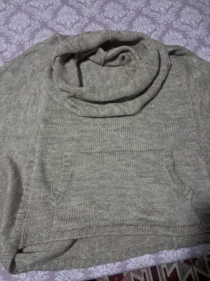 Gri renkte, boğazlı ve uzun kollu, bol kesim triko kazak. Bohem tarzda, orta boy uzunlukta, rahat ve şık bir günlük kazak.