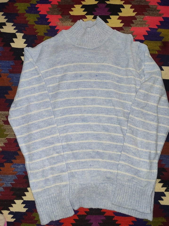 Gri renkte, boğazlı ve uzun kollu yün örgü kazak. Rahat kesimi ve ince çizgileriyle günlük kullanıma uygun, konforlu bir parça.