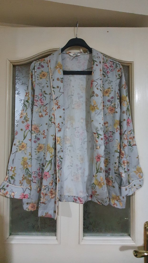 Gri taban üzerine renkli çiçek desenleriyle bohem tarzda, uzun kollu ve bol kesim midi kadın sabahlığı.