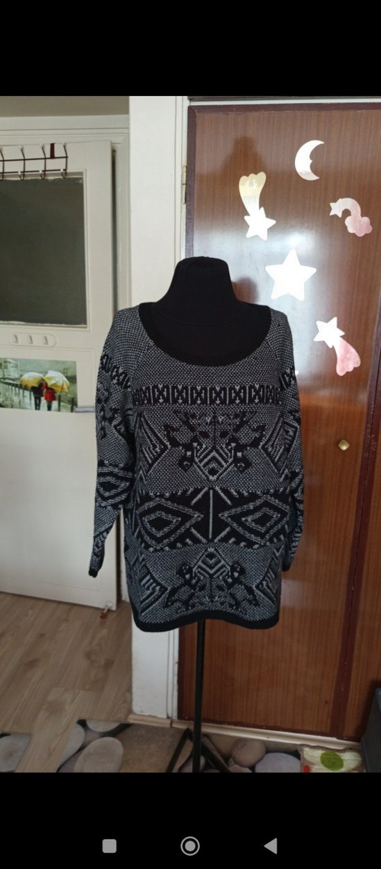 Gri renkli, yuvarlak yaka ve uzun kollu örme kadın kazak. Bohem tarzda, desenli ve rahat kesim, günlük kullanıma uygun.