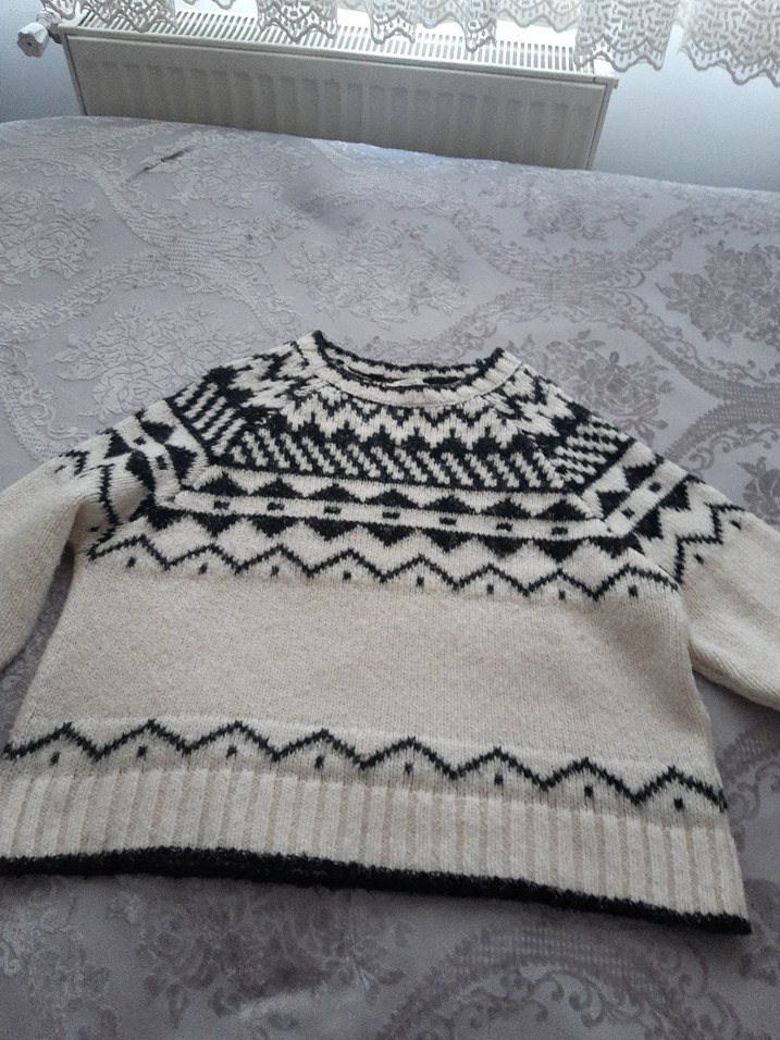 Gri ve beyaz renklerde, bohem desenli, örgü dokulu, uzun kollu, yuvarlak yakalı, bol kesim kadın kazak. Rahat ve günlük kullanıma uygun.