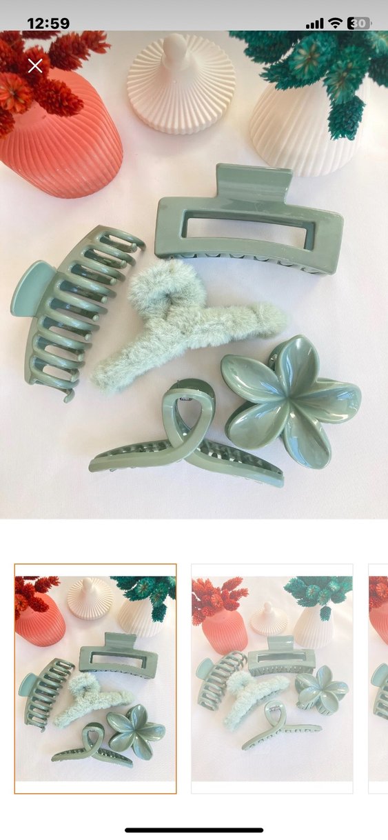 Bohem tarzda, gri plastik ve kürklü detaylı kadın saç tokaları seti. Minimalist ve şık görünüm için idealdir.