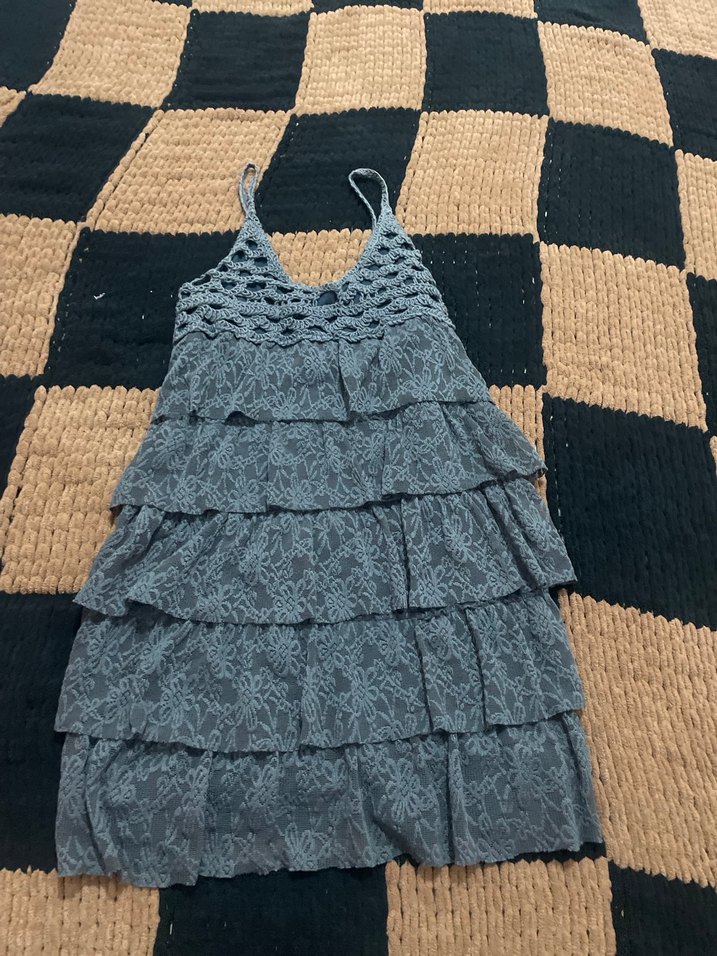 Uzun, bol kesim örgü elbise, straplez yaka ve ince askılıdır. Kat kat fırfır detayları ve gri batik desen ile bohem tarzındadır.