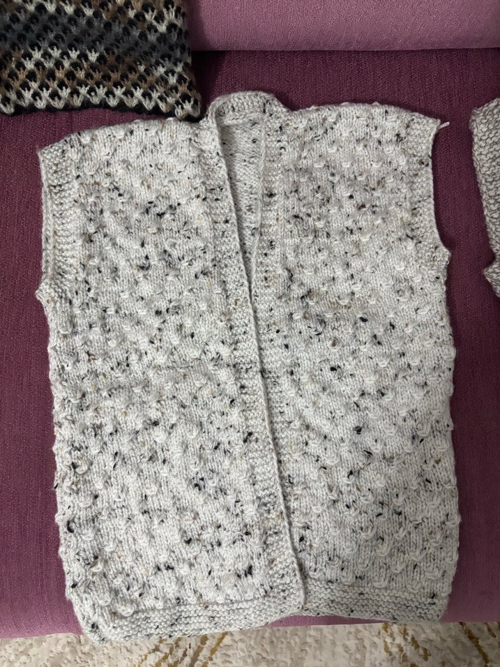 Gri renkli, bohem tarzda, örgü kadın yelek. Salaş kesim, kolsuz ve boğazlıdır. Midi boyda, günlük kullanıma uygundur.