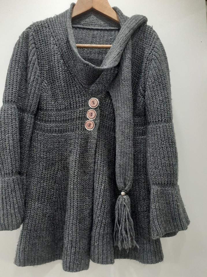 Geniş kesim, uzun kollu, gri triko hırka. Üç düğme ve püskül detaylı, bohem tarzda midi uzunlukta.
