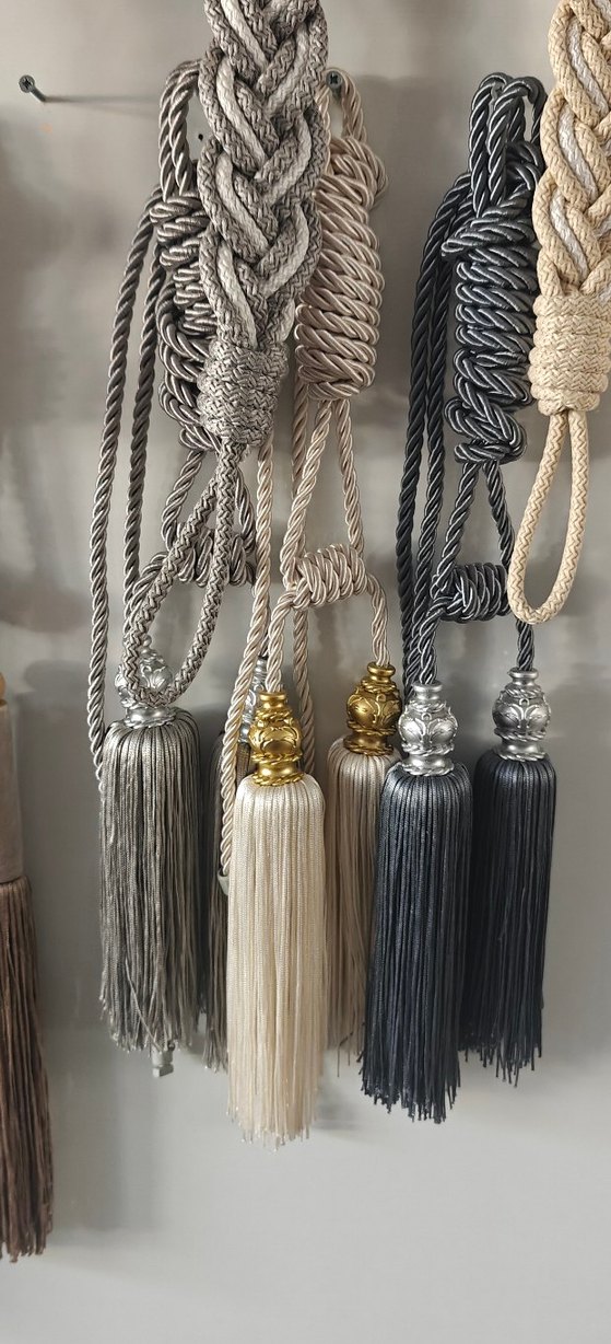 Bohem tarz gri nakışlı perde bağları, metalik detaylı süslü püsküllerle. Pencere dekoruna dokulu ve şık bir görünüm katar.