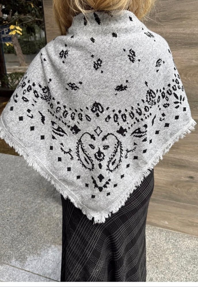 Gri örgü şal, bohem desenlerle ve püsküllü kenarlarla sıcak ve retro bir tarz sunar.