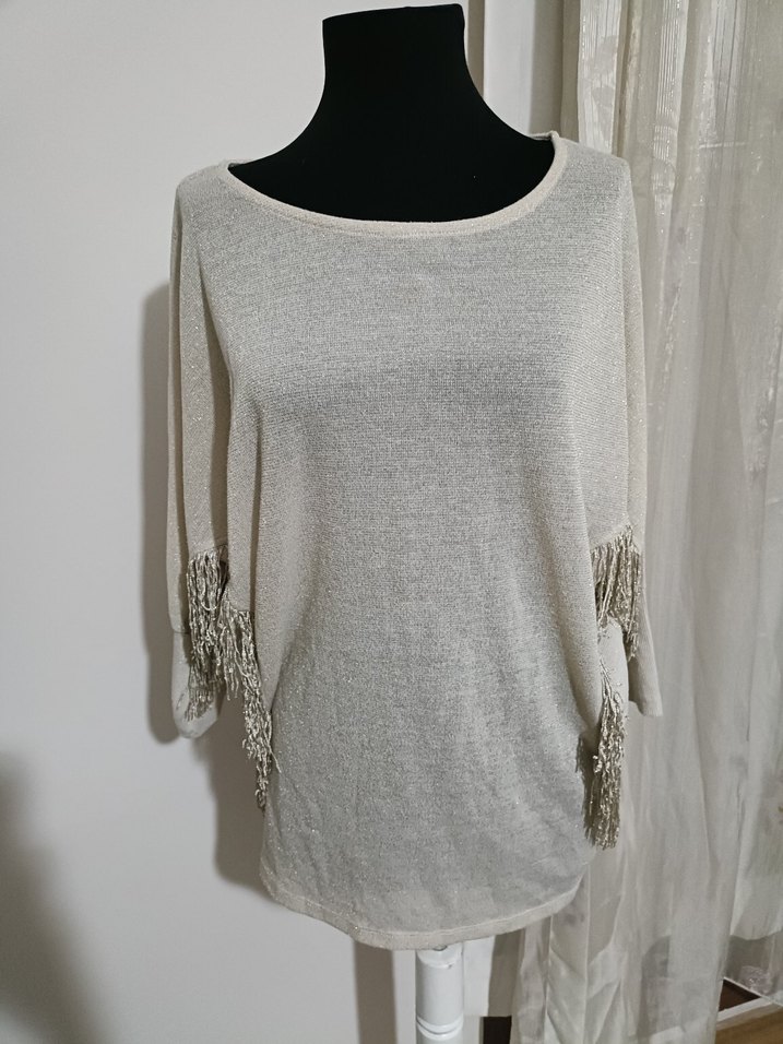Gri renkte, uzun kollu ve yuvarlak yakalı, bohem tarzda püskül detaylı, bol kesim kadın triko kazak.
