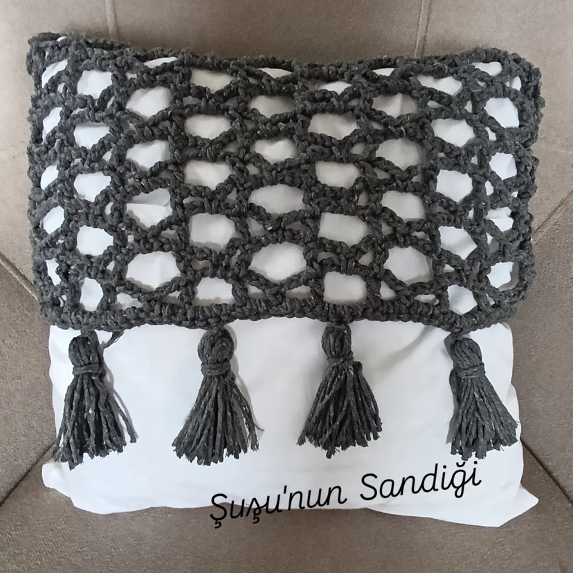 Gri renkli, tığ işi örgü kırlent kılıfı bohem tarzda püskül detaylarıyla sıcak ve retro bir görünüm sunar. 40x40cm ölçüsündedir