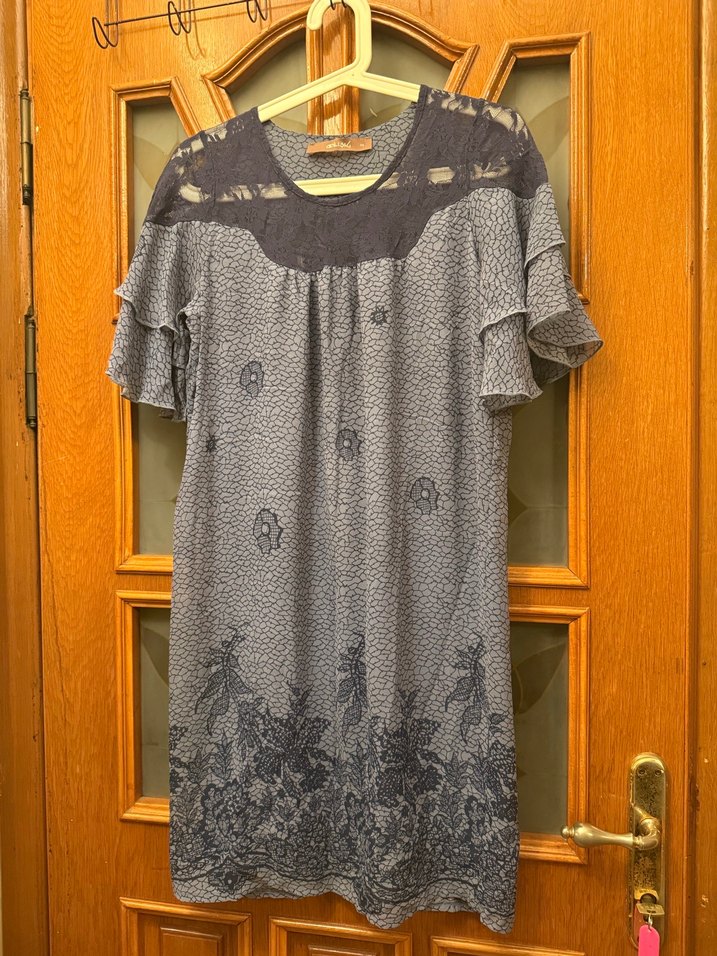 Gri, kısa kollu, bol kesim bohem hamile tunik. Fırfırlı detaylar, bağlama desen ve yuvarlak yaka içerir, günlük kullanım için uygundur. Standart beden desem yeridir