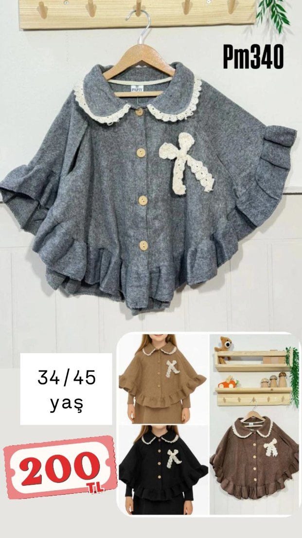 Gri triko kumaştan, uzun kollu, yakası kesimli ve nakışlı desenli kız panço. Bohem tarzda, bol kesim ve volan detaylıdır. 34-45 ay arası yaş için uygundur. noter birinin fiyatı üstünde yazılıdır