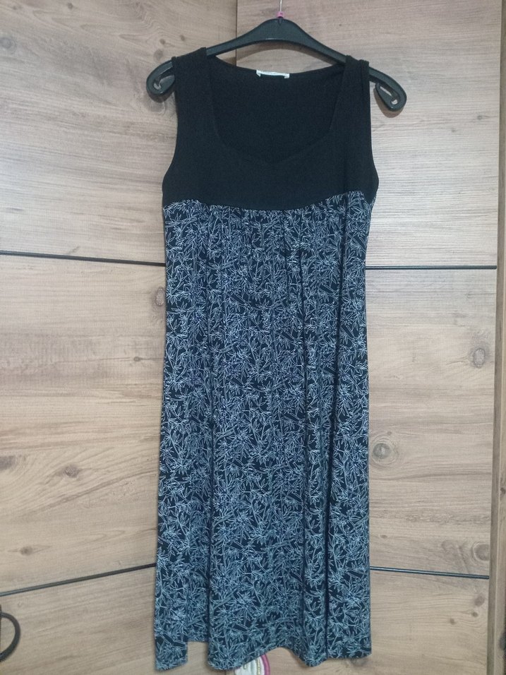 Kolsuz, uzun gri hamile elbisesi, salaş kesim ve pileli batik desenlidir. V yaka ve rahat sentetik kumaşa sahiptir.
