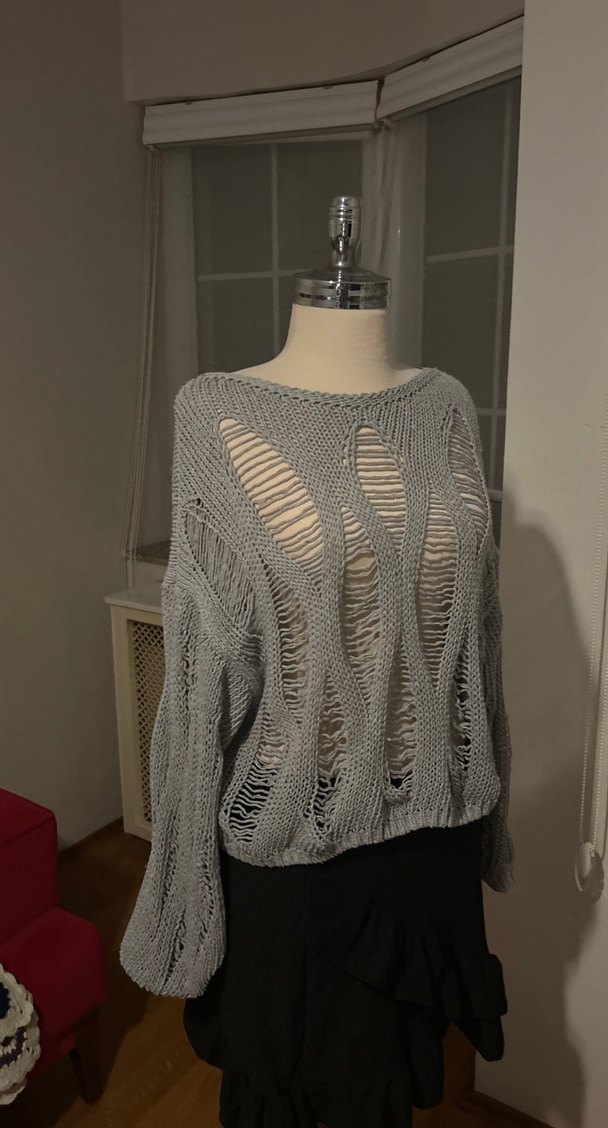 Gri renkli, örgü kumaştan, salaş kesim ve tekne yaka kadın kazak. Uzun kollu, bohem tarzda, açık örgü detaylarıyla günlük kullanıma uygun.