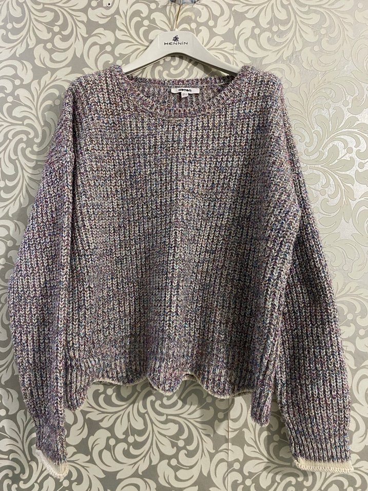 Salaş kesim gri triko kazak, uzun kollu ve yuvarlak yakalı. Rahat tie-dye deseniyle bohem tarzı için uygundur.