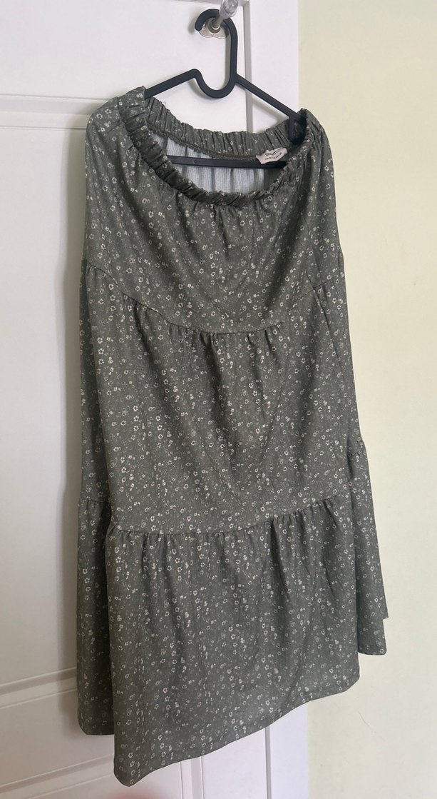 Yumuşak sentetik kumaştan, salaş kesim gri uzun etek. Drapeli detaylara ve hafif çiçek desenine sahiptir, minimalist bohem tarzındadır.