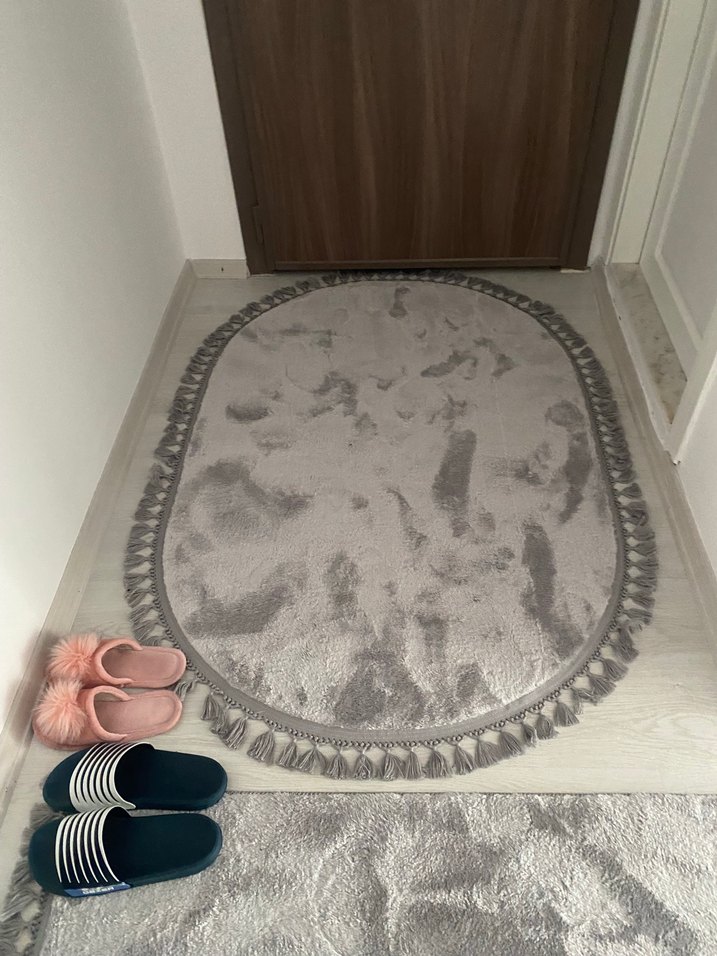 Gri oval halı, tie-dye deseni ve bohem tarzı püsküllerle çevrili 3 parça 100 x150 100x250 100x450 ölületinfe çok az kullanıldı evime rengi uymadığı için satıyorum