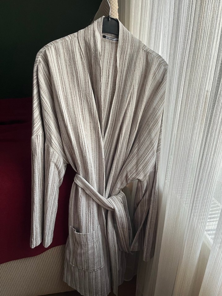 Gri bohem stilde, dokulu yumuşak kumaştan, kuşaklı ve ön cepli bornoz. Rahat kesimi ve sade tasarımıyla konfor sağlar.
