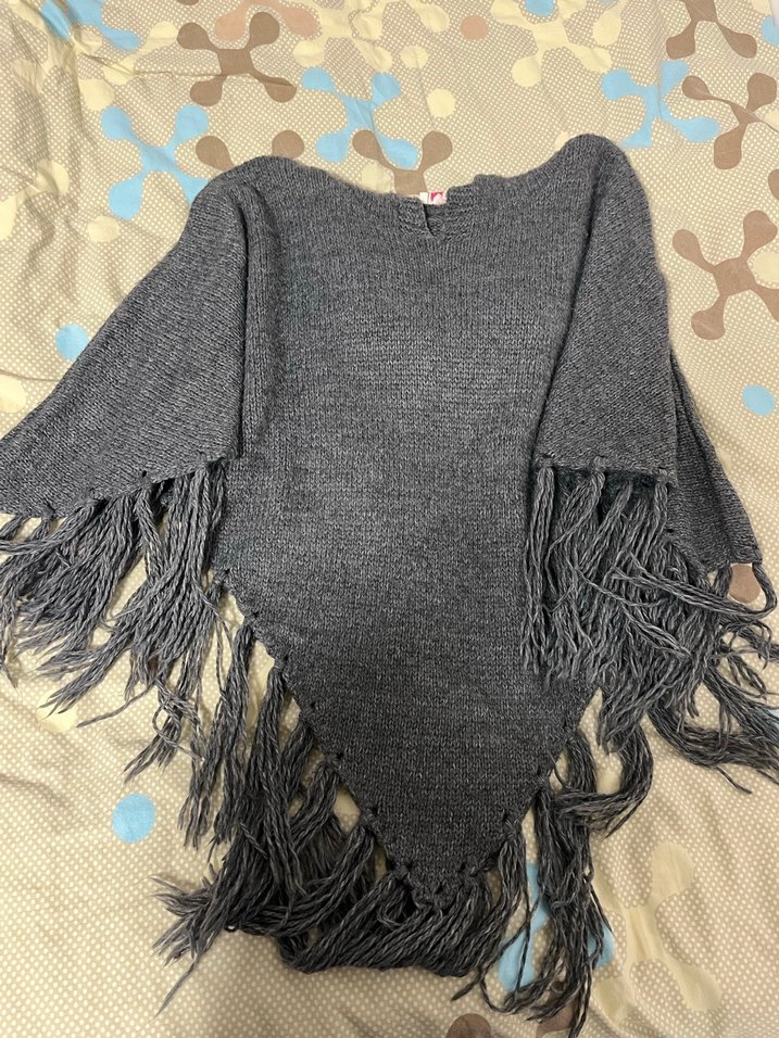 Gri renkli, uzun kollu, yuvarlak yaka, bol kesim örgü panço. Bohem tarzda püsküllü, midi boyda, günlük kullanıma uygun.