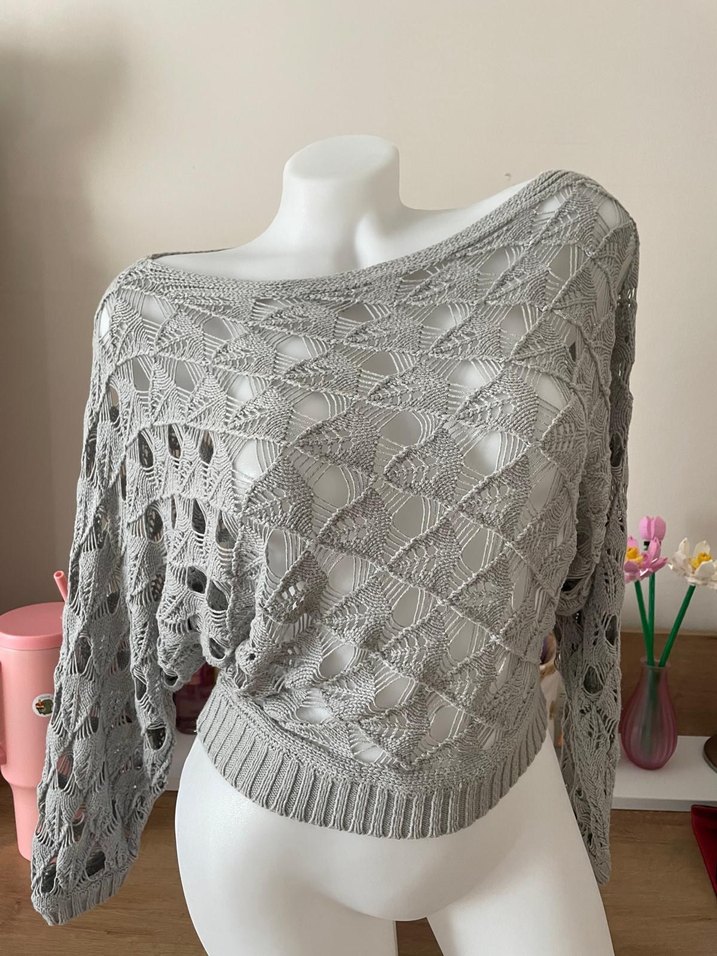 Gri renkli, tek renk ve örgü yapıda kadın kazak. Salaş kesimi, uzun kollu ve kayık yaka detaylarıyla bohem tarzda, günlük kullanıma uygun.
