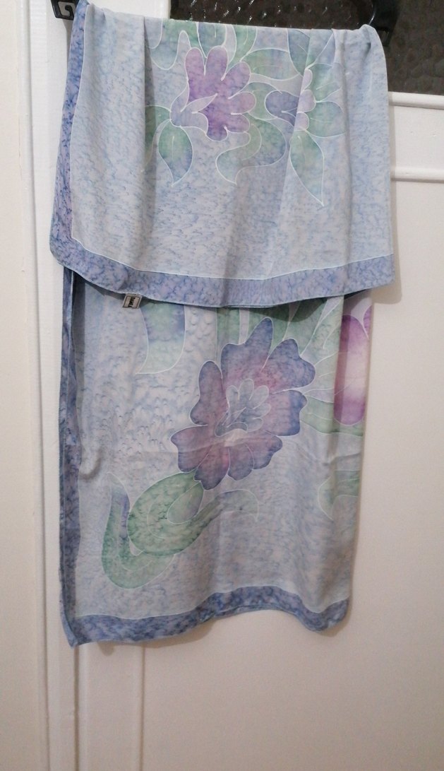 Mavi pastel tonlarda çiçek desenli, dökümlü gri tonlarda eşarp şal hayırlı olsun kare 114 cm