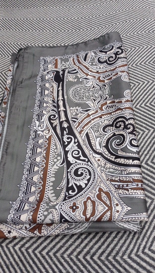 Yumuşak sentetik kumaştan, bohem desenli gri dökümlü kadın şalıdır. Retro ve hippie tarzını yansıtır.