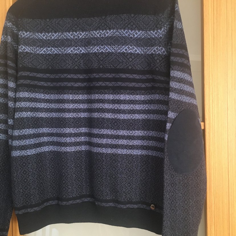 Lacivert renkli, ve yuvarlak yaka erkek triko kazak. Örgü detaylı, dirsek yamalı, rahat ve bohem tarzda gündelik kullanıma uygun.