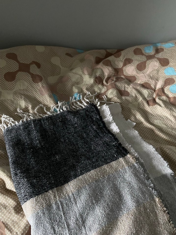 Kadınlar için gri tonlarında, dokulu kumaştan yapılmış, bohem tarzda drapeli rahat şal. Retro ve hippie havası verir.