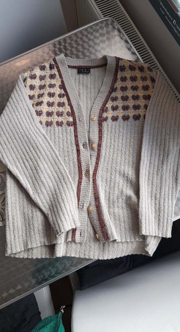 Gri renkli, bol kesim erkek hırka, uzun kollu ve yuvarlak yakalıdır. Örgü dokusu ve omuz kısmındaki ince desenle bohem tarzı sunar. Günlük kullanım için uygundur.