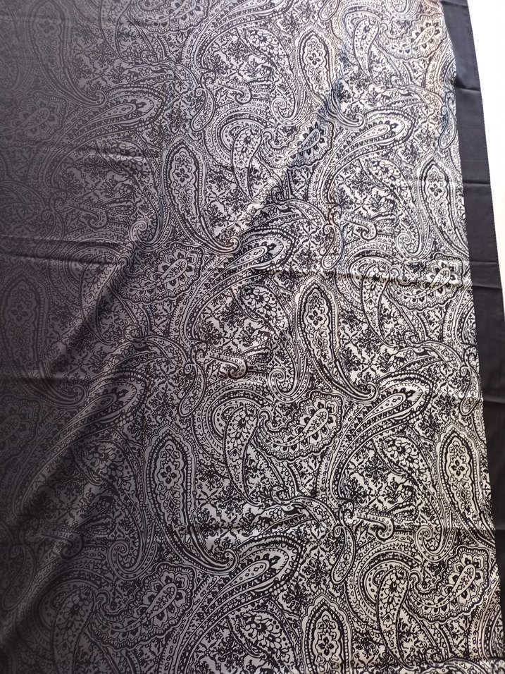 Gri renkte, saten dokulu, drapeli ve bohem paisley desenli kadın şalı, retro ve hippie tarzına uygundur.