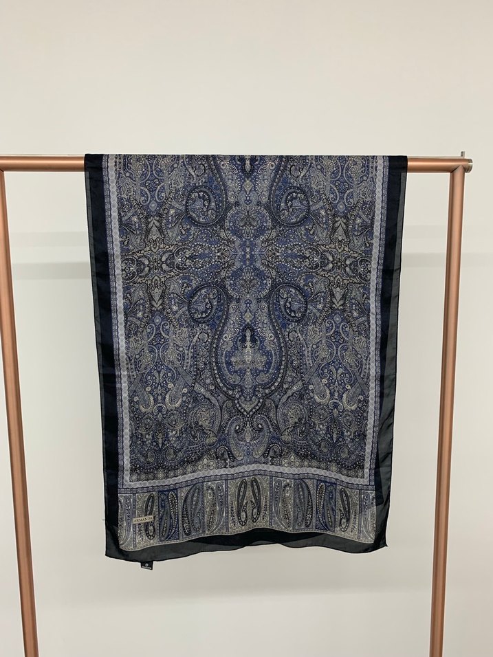Gri bohem tarzı bu saten şal, ince işlemeli paisley desenleri ve drapeli tasarımıyla retro bir görünüm sunar. İpeksi jakar şal görsellerde göründüğü gibidir sorunsuzdur