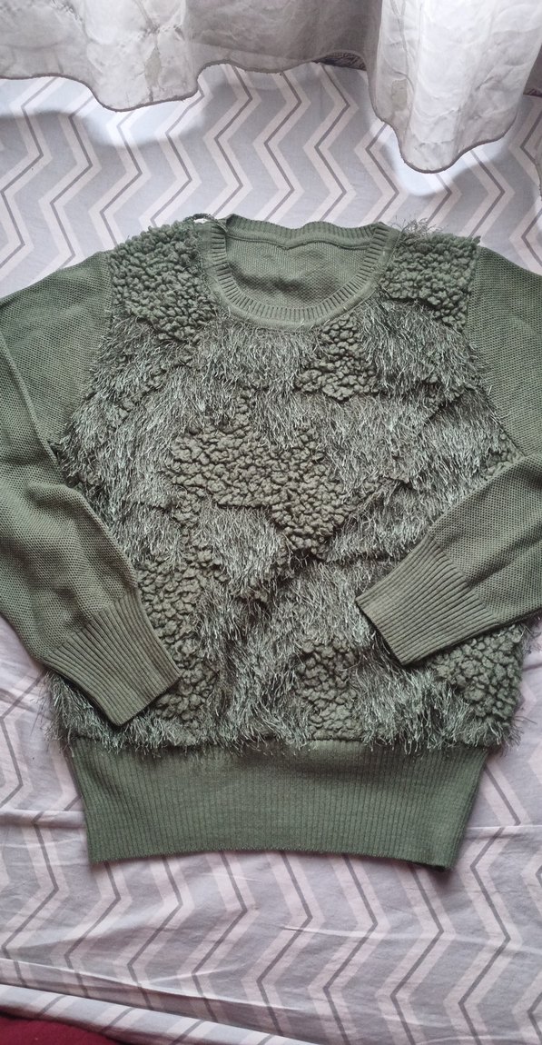 Gri renkte, yuvarlak yaka ve uzun kollu, bol kesim kadın triko kazak. Dokulu örgü detayıyla bohem ve rahat bir görünüm sunar.