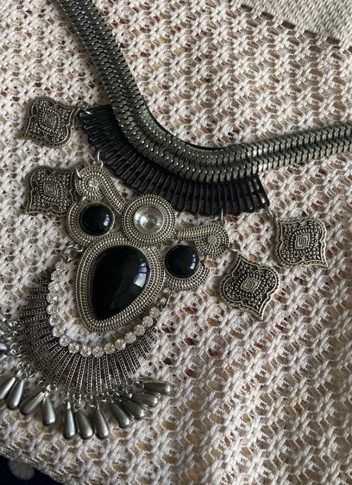 Boncuklu detaylara sahip gri uzun kolye, bohem tarzda nakış desenlerle ve retro görünüme sahiptir. Günlük kullanım için uygundur.