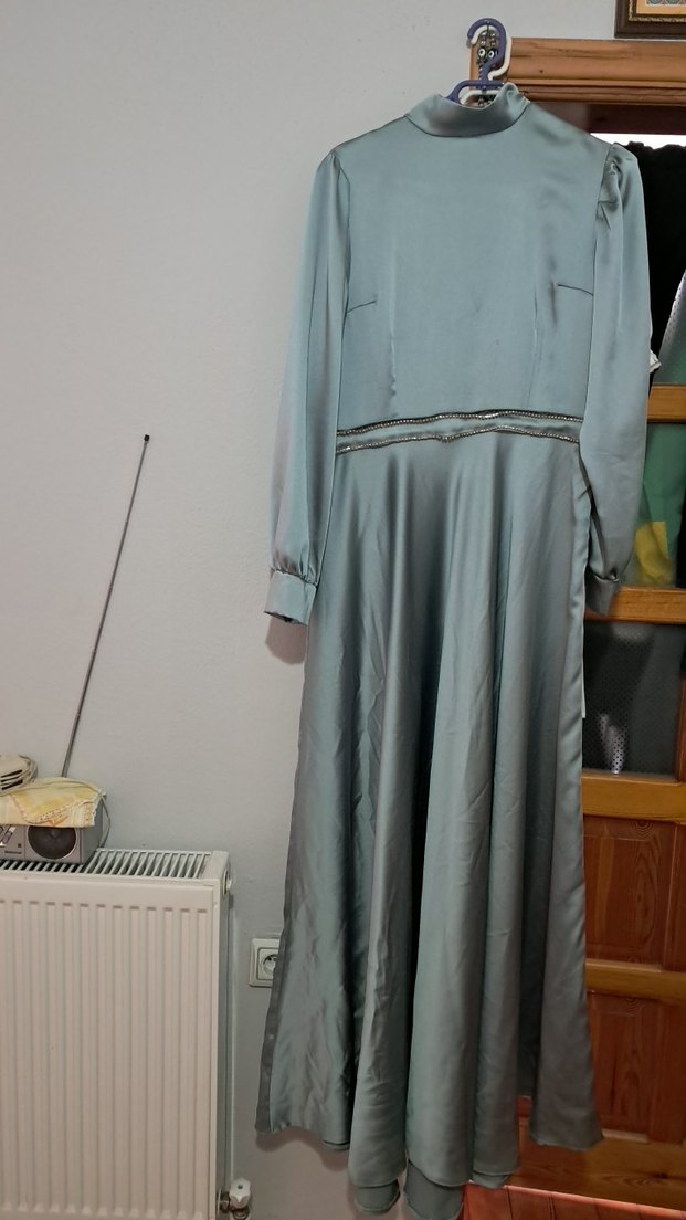 özel dikimdir fiyatta yardımcı olunur takasa açıktır Gri renkte, yüksek yakalı ve uzun kollu, bol ve drapeli kesime sahip uzun elbise. Yumuşak sentetik kumaştan, vintage bohem tarzını yansıtıyor.